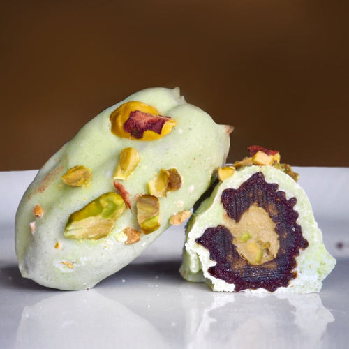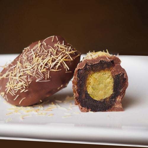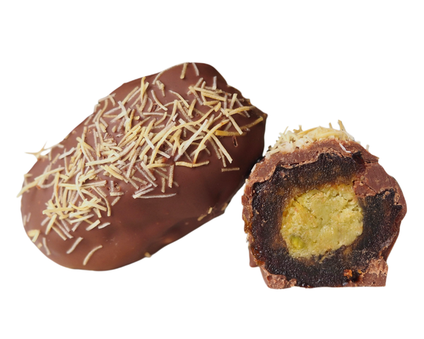 Milchschokolade umhüllt die Dattel sanft und bringt die Pistazienaromen perfekt zur Geltung.