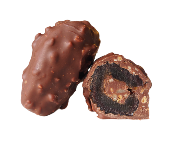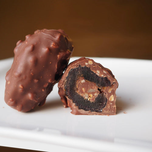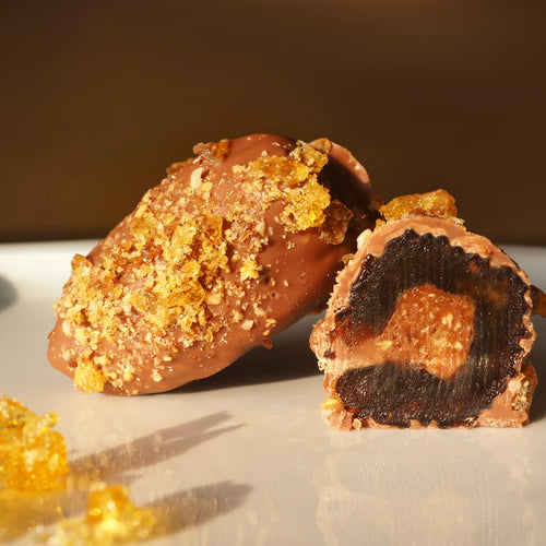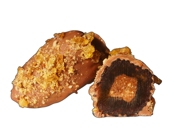 Zarte Milchschokolade umschließt die Medjool-Dattel und wird von knusprigen Karamellstückchen gekrönt, die für ein feines Spiel aus Schmelz und Crunch sorgen.