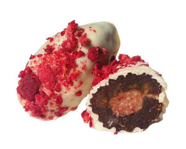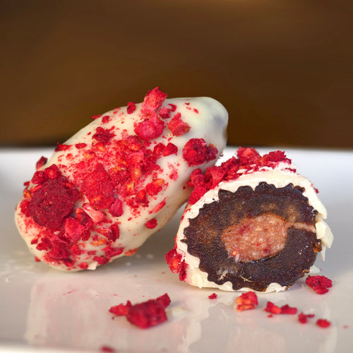 Feinste weiße Schokolade umhüllt die edle Medjool-Dattel und wird von gefriergetrockneter Himbeere veredelt, die für eine lebendige Frische und feine Säure sorgt.