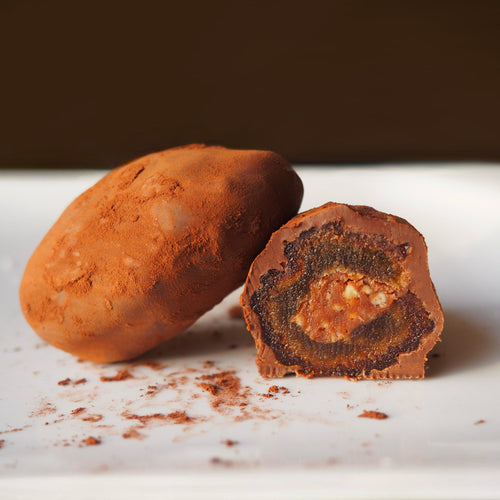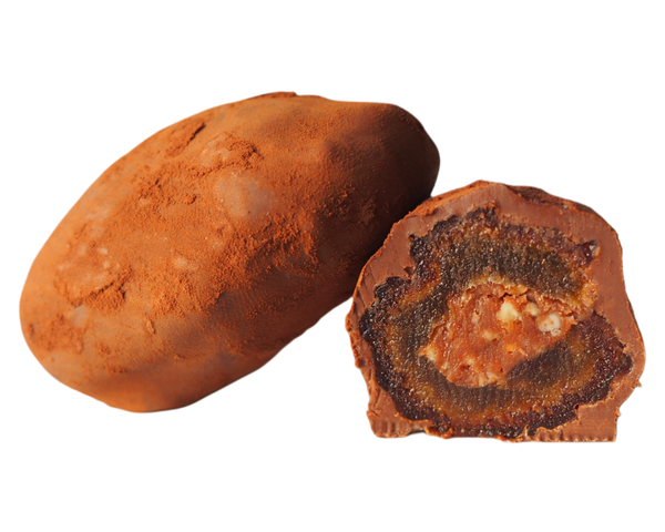 Cremiges Karamell und geröstete Haselnuss bilden das Herz dieser edlen Medjool-Dattel.