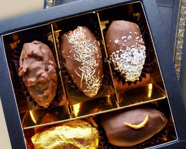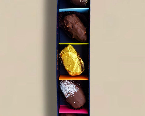 Erlesene Medjool-Datteln, ausgewählt für ihr zartschmelzendes Fruchtfleisch, veredelt mit kostbaren Zutaten und umhüllt von feinster Edelschokolade.