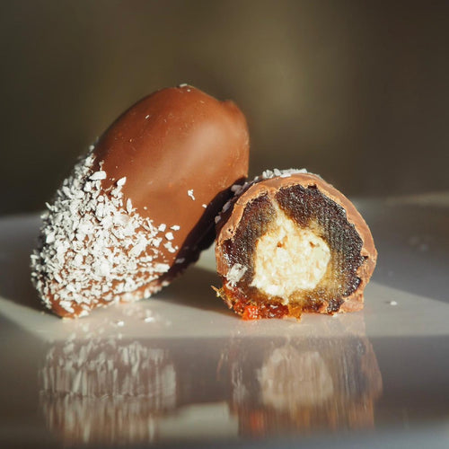 Coco Blanc vereint die natürliche Süße der Medjool-Dattel, mit fein umhüllter Milchschokolade und aromatischen Kokosraspeln.